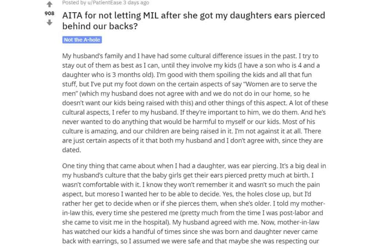 Os filhos da mulher ficou com a sogra por um tempo, e quando retornou para a mãe, a menina estava com as orelhas furadas. “Até no final de semana passado, quando minha sogra foi deixar meus filhos em casa e eu notei que minha menina estava com as orelhas furadas! Minha sogra contou que foi minha cunhada quem furou as orelhinhas. Disse que era tradição e que ela tinha feito das outras crianças da família”, E ainda sentiu que teve a privacidade invadida. “Eu me senti tão violada! Eu peguei meus filhos e mandei minha sogra ir embora imediatamente. Meu marido também ficou muito bravo e discutiu com a mãe dele”, terminou.