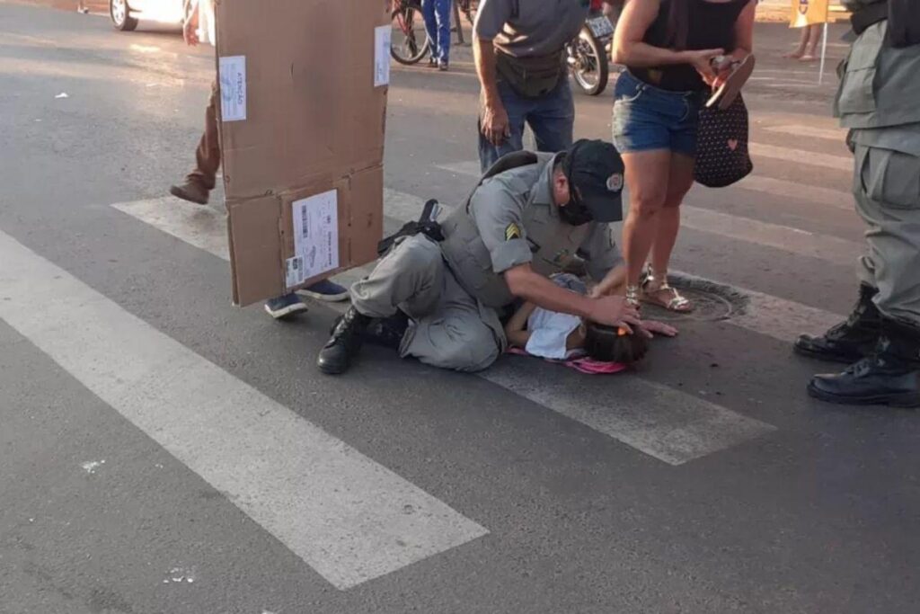 Um Policial Militar acalmou uma menina, de 7 anos, que estava muito nervosa após ser atropelada enquanto atravessava a faixa de pedestre junto com a mãe, em Goiânia, em uma avenida do Setor Parque Atheneu. O sargento Marcelo Marinho de Oliveira sentou no chão, fez carinho e conversou para deixa-la mais calma até a chagada do Corpo de Bombeiros, nesta segunda-feira, dia 2 de julho.