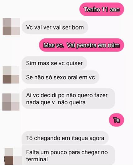 A mãe da criança contou que encontrou várias conversar no celular da filha com o suspeito e resolveu se passar pela criança. Ela disse à cunhada que o rapaz pediu mais de uma vez para se encontrar com a menina, mesmo ela contando que tinha só 11 anos.