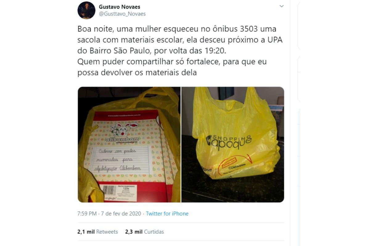 Ao publicar no Twitter fotos do material escolar e a explicação do que tinha acontecido, o post viralizou até que chegou aos olhos da mãe que havia esquecido a sacola. “Tentei achar o telefone da garagem de ônibus, mas não consegui. Quando corri pra internet pra pedir ajudar, vi a publicação do Gustavo”, contou ela.