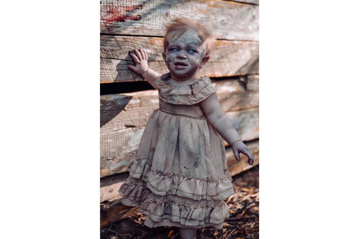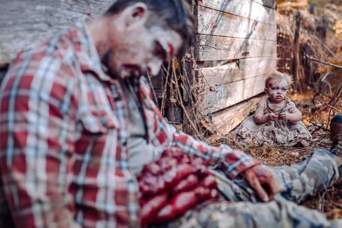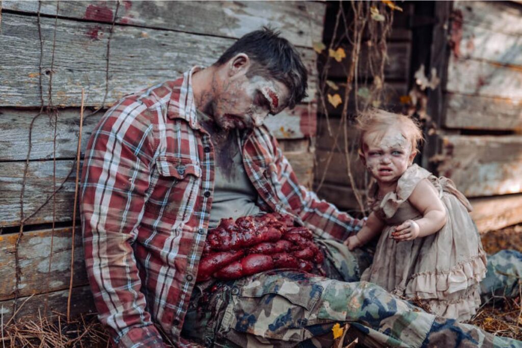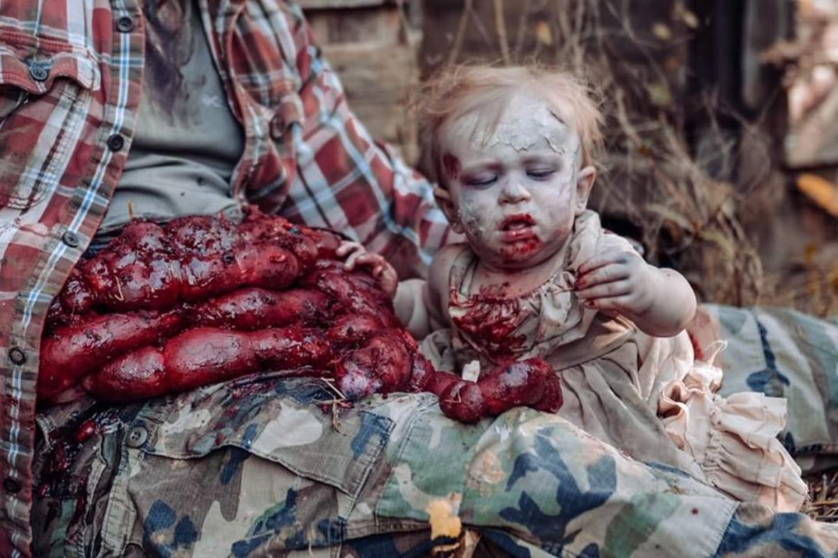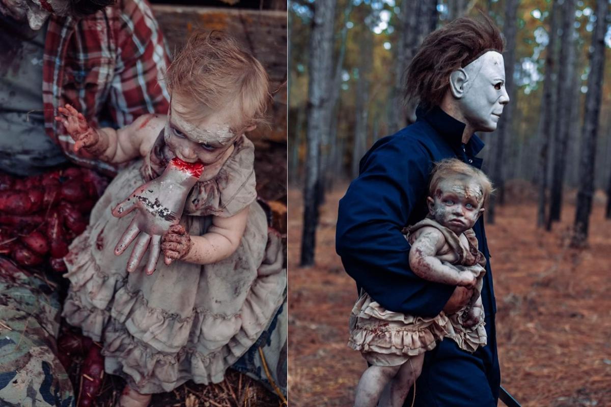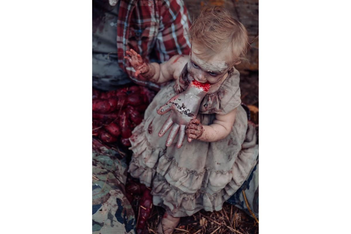 Tiffany Renfroe, de Oregan, nos Estados Unidos, fez um ensaio fotográfico para celebrar o Halloween. Ela transformou a filha Oakley, de 11 meses, em um zumbi e fez registros da menina “devorando” o próprio pai.