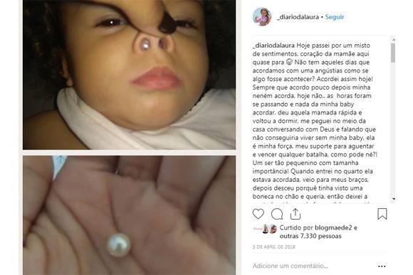 “Quando entrei no quarto ela estava acordada, veio para meus braços, depois desceu porquê tinha visto uma boneca no chão e queria, então deixei a vontade, até que ela fez cocô (como até ontem ela estava com um quadro de diarreia e já estava toda assadinha), fui pegar a fralda para trocar, enquanto ela estava brincando com a boneca, quando volto vejo Laura desconfiada de boquinha aberta olhando pra mim! Já tomei um susto daí, então perguntei se ela havia colocado algo na boca e pedi para abrir pra ver, então ela apontou para o nariz e me mostrou. Tinha uma PÉROLA dessas de bijuterias, meu Deus entrei em desespero e comecei a chorar, Laura inocente me olhava e começava a me beijar”.