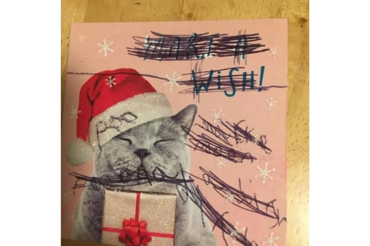 “Meu filho enviou 30 cartões como esse, que é o único que peguei para ver. Rezem por mim”, ela disse na publicação. Os cartões mostravam um gato cinza com um chapéu de Papai Noel, escrito “faça um pedido”. Porém, Oliver escreveu “cocô”, onde a frase estava escrita. Dentro do cartão, Oliver também fez vários rabiscos sobre cocô.