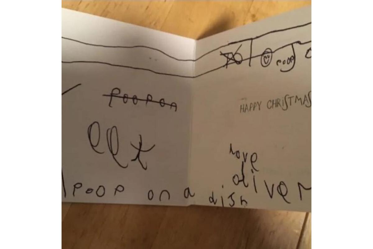 Oliver, de 7 anos, deixou a mãe Victoria Howllet muito constrangida ao escrever cartões de Natal para seus amigos de classe. Em um grupo do Facebook, Victoria publicou as fotos do cartão e escreveu como tudo aconteceu.