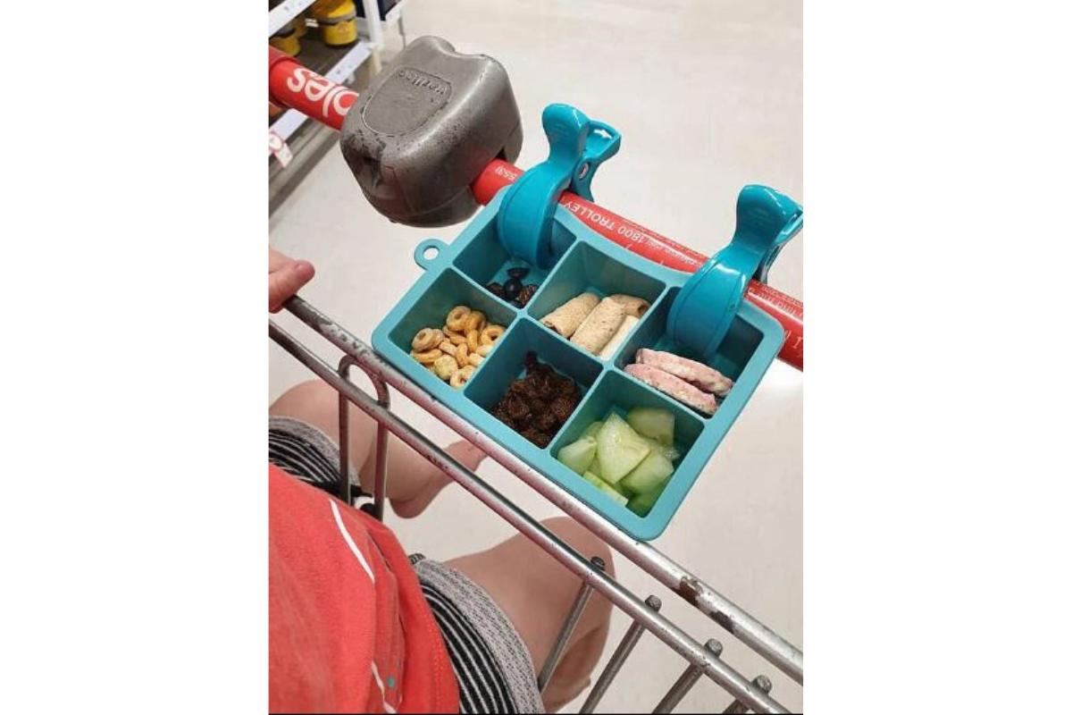 Tudo que ela usa é uma bandeja de fazer gelo e dois grampos. Ela colocou várias guloseimas e lanches nos quadradinhos e, enquanto fazia compras, seu filho lanchava. “Uma bandeja de cubos de gelo e dois grampos mantiveram meu filho feliz durante todo o passeio”, ela garantiu.