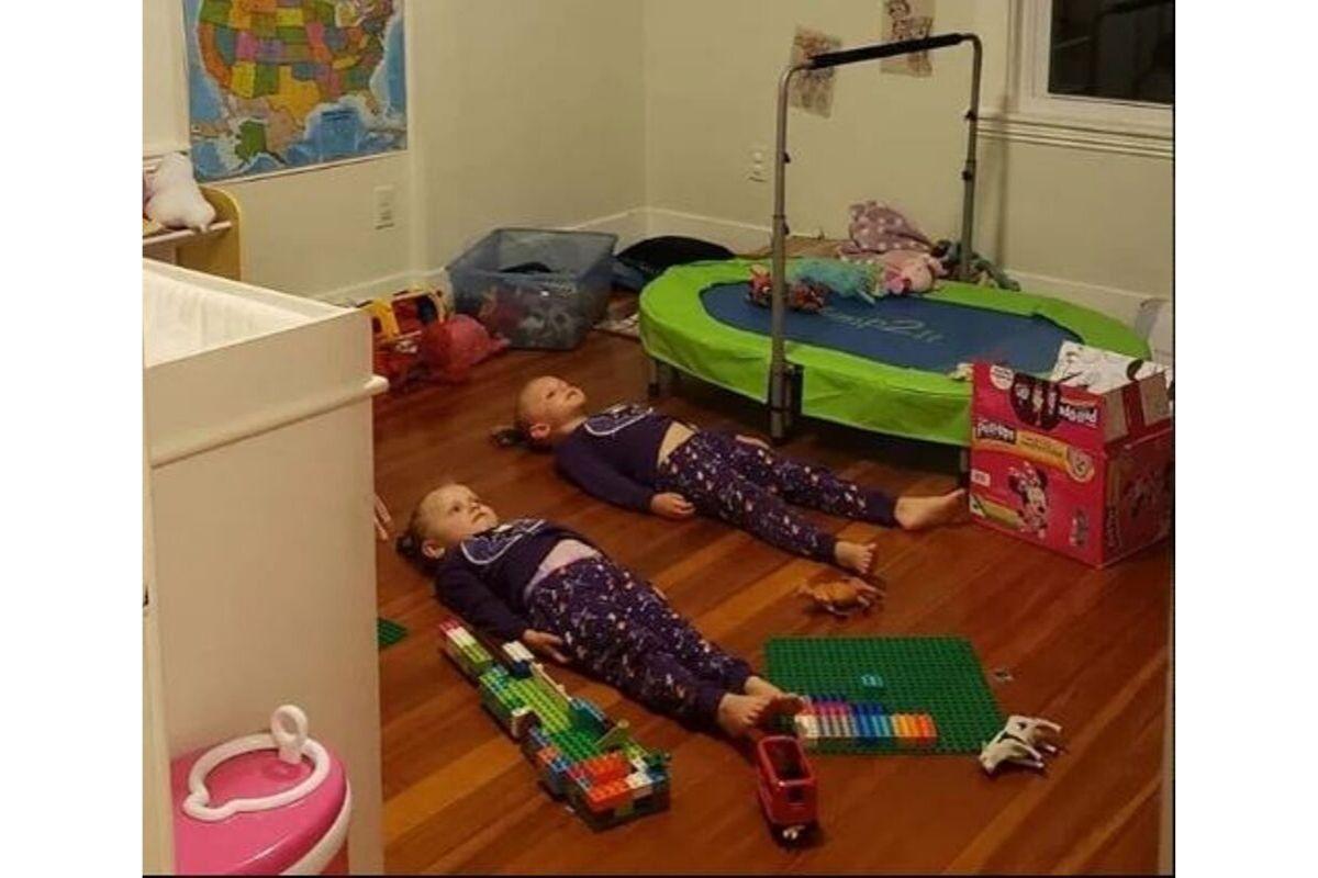 No Facebook, a mãe compartilhou a foto das duas meninas Hannelore, de 3 anos, e Emma, de 4 anos, deitadas no chão do quarto com a luz ligada. “Procurando uma maneira de manter seus filhos quietos? Compre para eles pijamas que brilham no escuro. Diga que eles precisam ficar quietos para carregá-los. Aqui está o resultado”, disse na publicação.