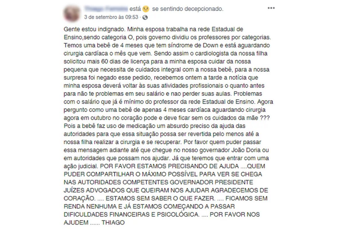 O marido da mulher fez um desabafo nas redes sociais explicando toda a situação, com isso a professora comentou para o G1. “Eu fiz o desabafo para mostrar o que o governo faz conosco. Eu não posso deixar minha filha com qualquer pessoa. Ela não pode pegar nenhuma bactéria, é uma cirurgia de peito aberto. Não é uma cirurgia simples”, contou. Confira o desabafo o pai abaixo: