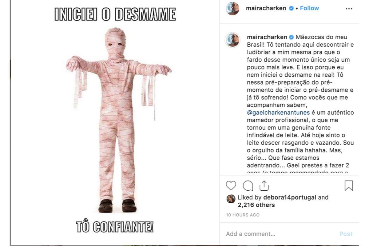 Na publicação, Maíra usou o bom humor ao seu favor para explicar a situação e pedir conselhos a mulheres que viveram o mesmo momento. “Tô nessa pré-preparação do pré-momento de iniciar o pré-desmame e já tô sofrendo!”, escreveu em legenda.