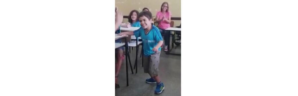 Desde bebê, Davi faz fisioterapia e os primeiros passos aconteceram na escola, diante dos aplausos de todos os amigos e com direito a um abração da professora!