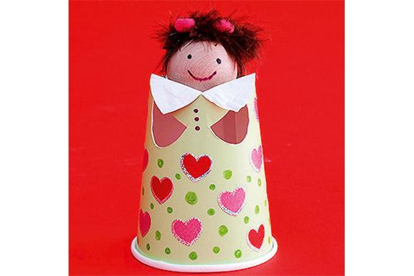 COMO FAZER: vire o copo de papel de cabeça para baixo e corte buracos para os bracinhos com uma tesoura pequena. Decore o copo usando canetinhas e adesivos. Adicione a cabeça usando uma bolinha de madeira (ou de pingue-pongue) colando-a na base do copo. Para o cabelo, use um pouco de penugem. Por fim, crie um colarinho de papel e cole logo acima dos buracos dos bracinhos. Faça uma família inteira para todo mundo brincar!