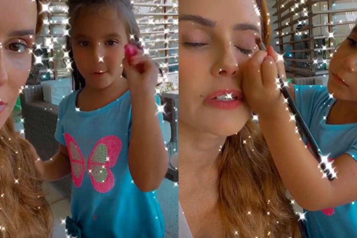 Nas imagens, a mãe mostra Maria Flor explicando o passo a passo da maquiagem que está fazendo. Bancando a influenciadora, ela finaliza o vídeo dizendo: “Gente, acabou. Vocês acharam linda? Escrevam qual maquiagem vocês querem que eu faça de noite”.