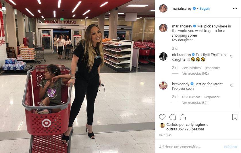“Eu disse para ela: escolha qualquer lugar no mundo para fazer compras. E ela respondeu: Target!”, contou Mariah na legenda da publicação. “É isso! Essa é minha filha!”, comentou o marido Nick Cannon, que é pai de Monroe. Mariah também é mãe de Moroccan, irmão gêmeo da menina.