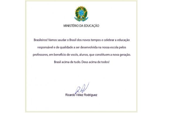 “Brasileiros! Vamos saudar o Brasil dos novos tempos e celebrar a educação responsável e de qualidade a ser desenvolvida na nossa escola pelos professores, em benefício de vocês, alunos, que constituem a nova geração”, diz a carta. O documento termina com o slogan usado pelo presidente Jair Bolsonaro durante sua campanha eleitoral: “Brasil acima de tudo. Deus acima de todos”.