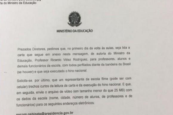 Além disso, os diretores também precisariam ler uma carta assinada pelo Ministro da Educação, Ricardo Vélez Rodriguez, para professores, alunos e demais funcionários com o slogan da campanha de Bolsonaro.