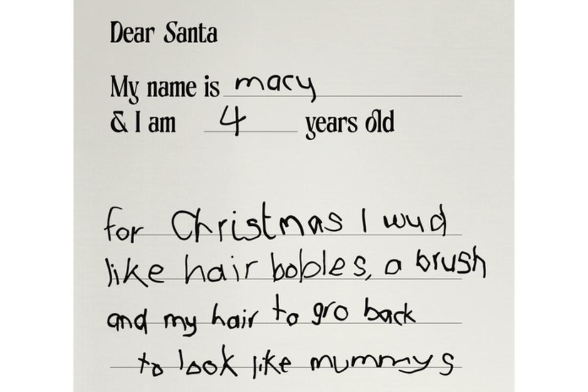 Na carta de Macy, a menina diz ao Papai Noel que gostaria que seu cabelo voltasse a crescer, como o de sua mãe.