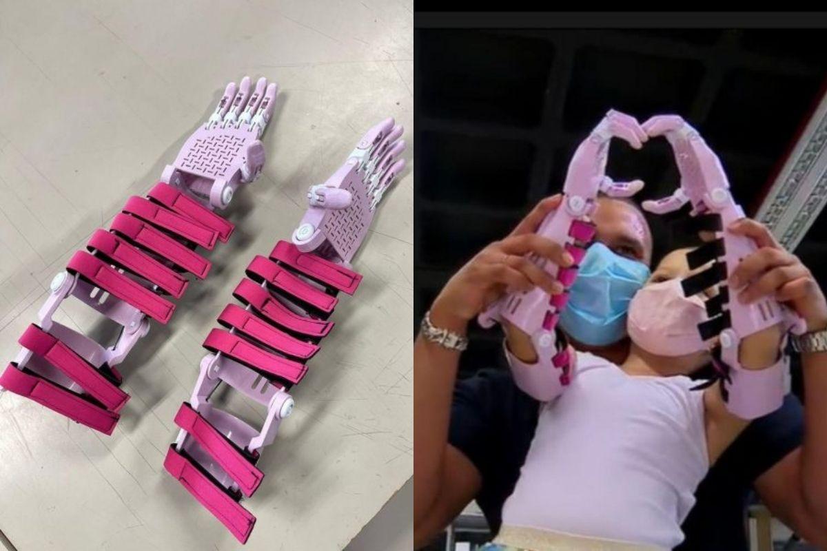 Alunos de uma universidade em Brasília desenvolveram uma prótese de mão em uma impressora 3D e presentearam Maria Beattriz Santana da Costa, que perdeu as mãos por causa de uma infecção. A menina ficou muito feliz com o gesto e ganhou a prótese da cor escolhida: rosa.