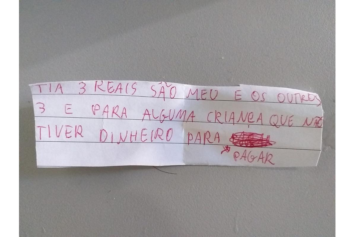 “Hoje quando entrei em sala, uma criança veio me entregar a contribuição espontânea dos pais para a lembrancinha de páscoa. Quando desenrolei o papel em que o dinheiro estava embrulhado, me deparei com este bilhete! Vocês não tem noção o quanto isso me emocionou”, escreveu a professora