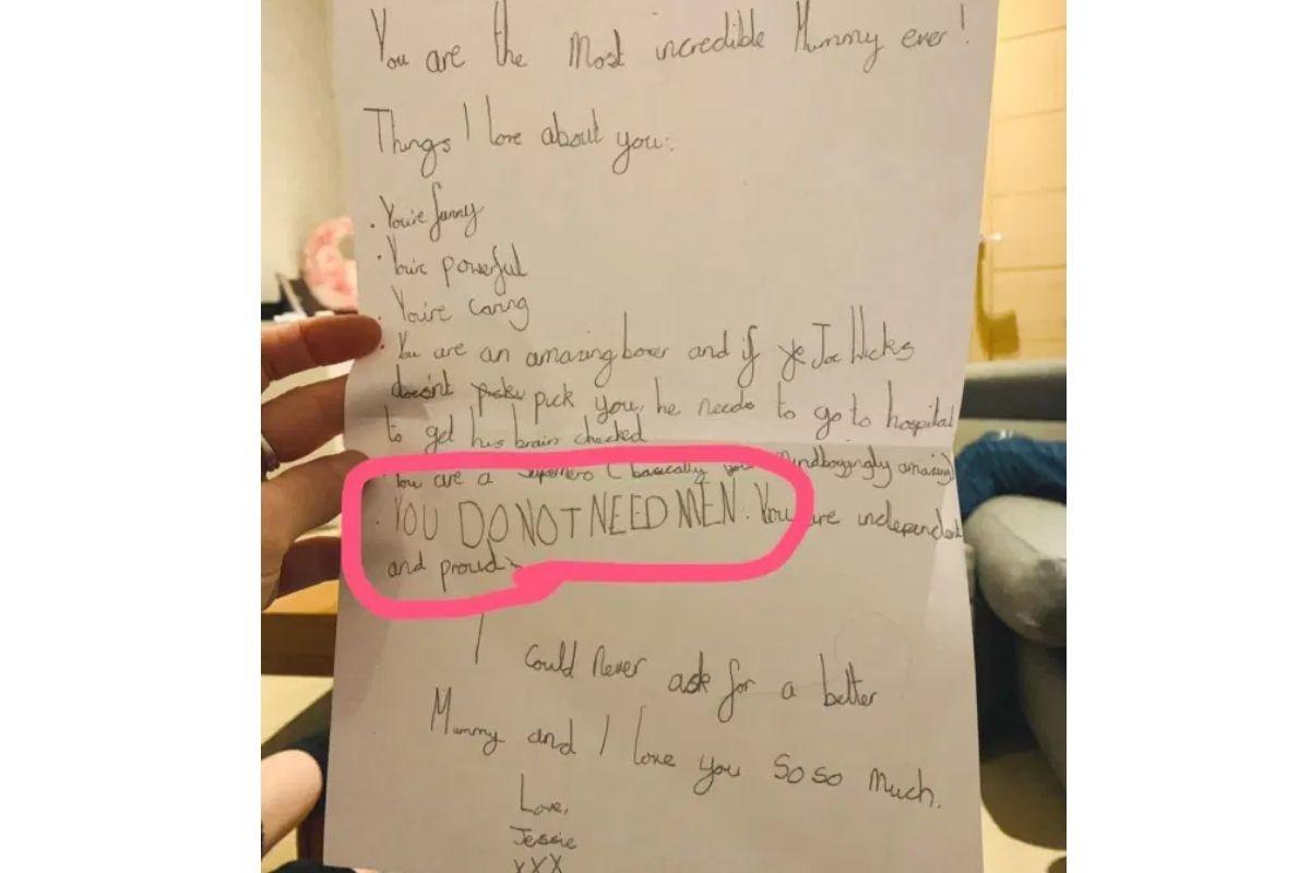 A carta dizia: “Você é a mãe mais incrível de todas”, e então listava os motivos pelos quais Jessie a amava, como: “você é poderosa”, “você é engraçada” e “você é atenciosa”. Em outro determinado momento, após perceber o sofrimento da mãe com o término recente, a mãe escreveu: “Você não precisa de homens. Você é independente e eu me orgulho”, disse a criança, que completou: “Eu nunca poderia pedir uma mãe melhor e eu te amo tanto. Jessie.”
