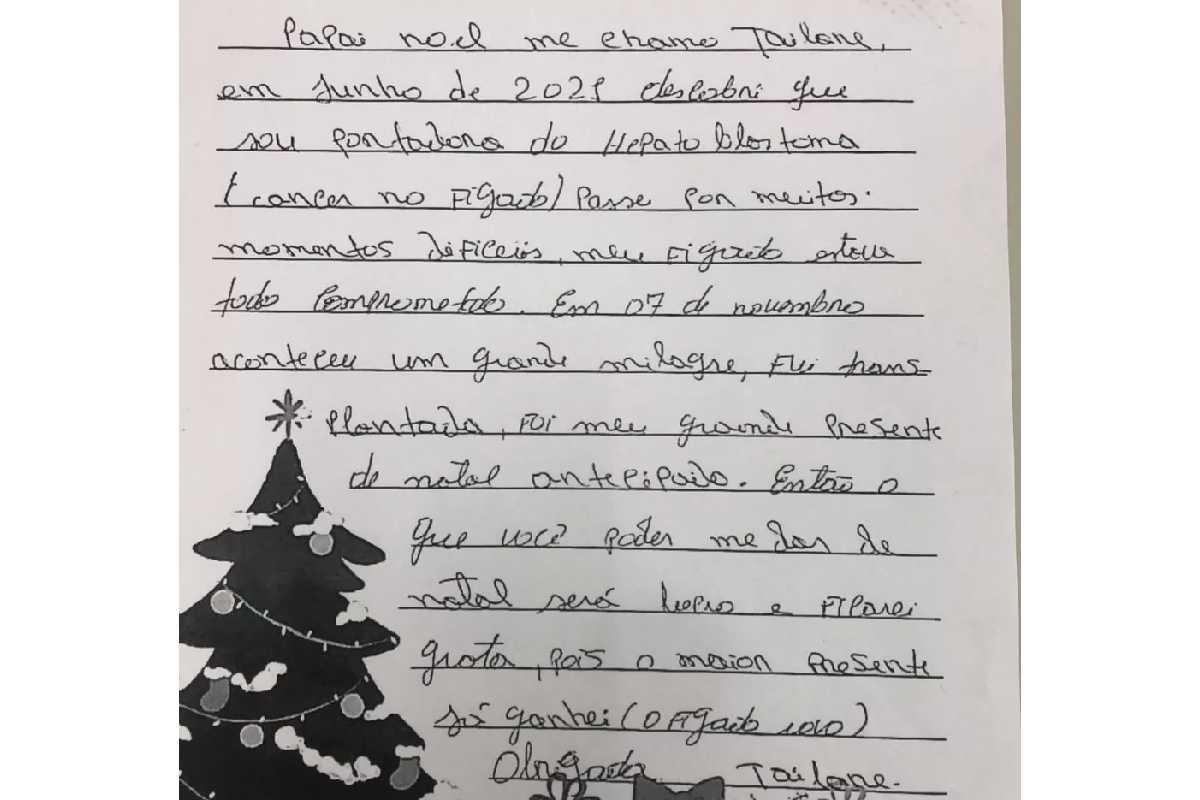 Tailane Alves da Silva, de 12 anos, mudou o protocolo ao enviar a carta para o Papai Noel neste ano. A menina não pediu nenhum presente, muito pelo contrário, ela aproveitou a oportunidade para agradecer por um presente que já ganhou: a vida.