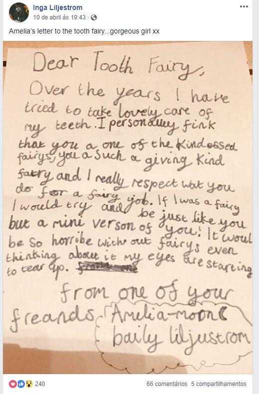 A Fada do Dente é uma das personagens mais comuns no mundo infantil. A mãe Inga Liljestrom compartilhou em seu Facebook uma carta que sua filha, Amelia, escreveu para a Fada do Dente.