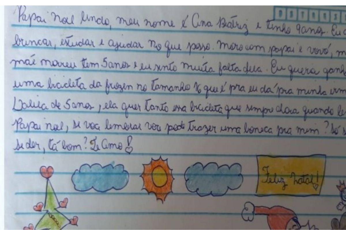 A carta de Natal de uma menina viralizou nas redes sociais com um pedido solidário. Ana Beatriz, de 9 anos, escreveu no bilhete para o ‘’Papai Noel’’ que queria uma bicicleta para dar à irmã. Ela fez questão de ressaltar como ela foi uma boa menina neste ano para mostrar que realmente merecia ganhar o presente, mas ela emocionou os internautas ao contar que a mãe morreu e que mora com o pai e avó.