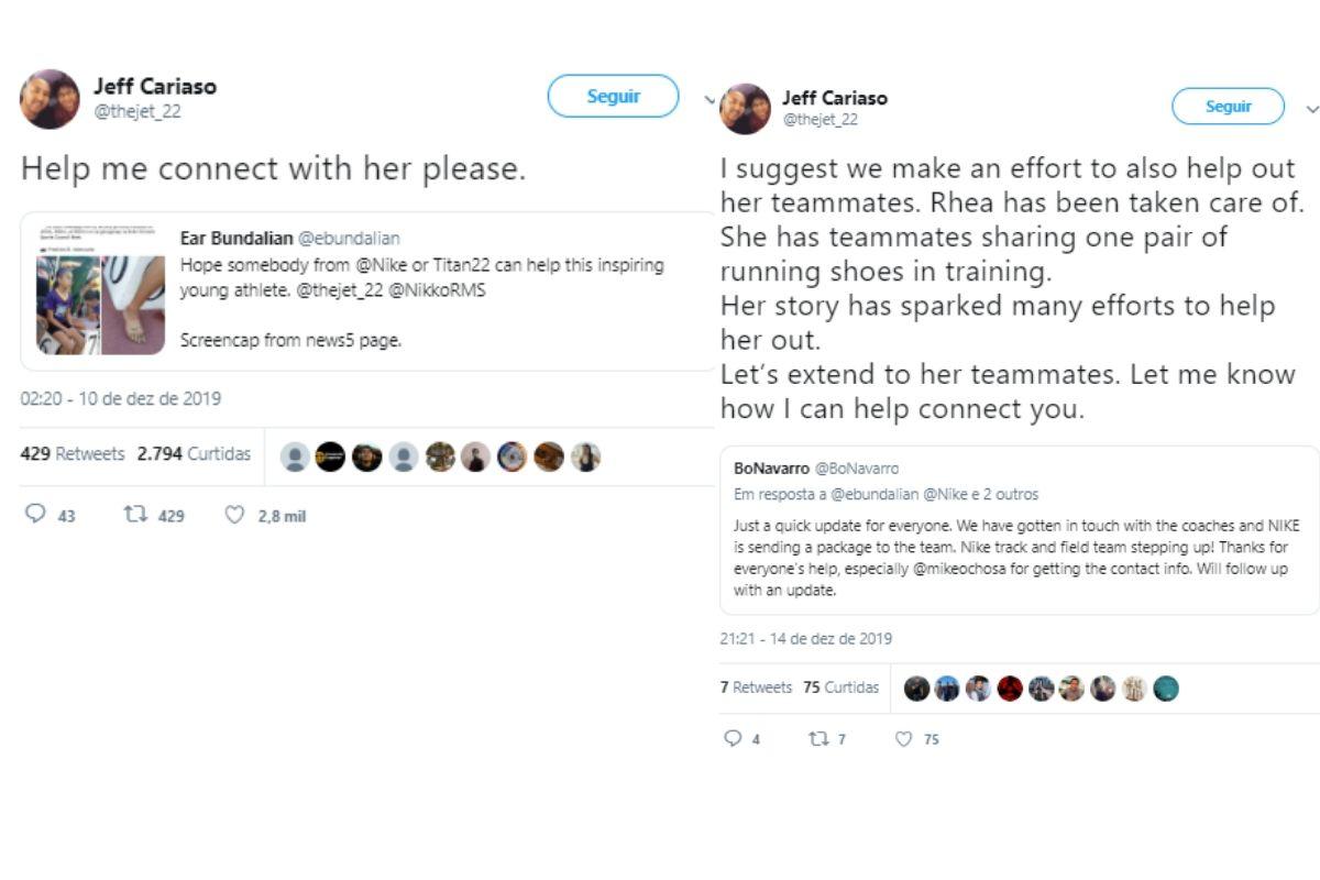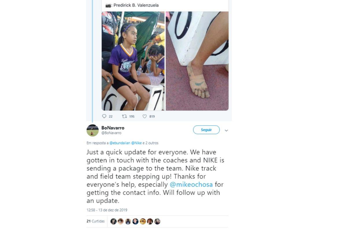 O caso chegou até a direção da Nike, que agiu rápido. A equipe da marca ficou determinada em ajudar essas crianças. “Entramos em contato com os treinadores e a NIKE está enviando um pacote para a equipe. Equipe de atletismo da Nike se intensificando!”, escreveu BoNavarro para Jeff no Twitter.