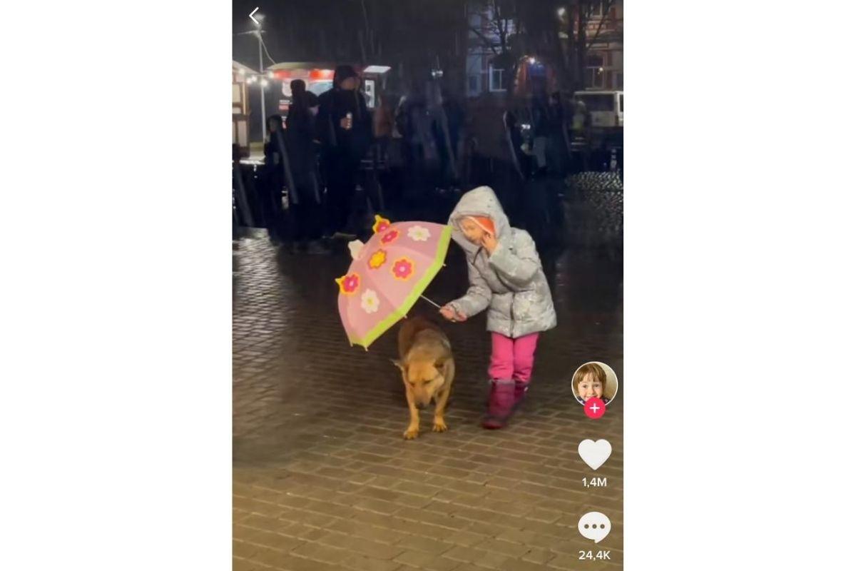 Masha ofereceu o próprio guarda-chuva para proteger o cachorro (Foto: reprodução / vídeo / TikTok)