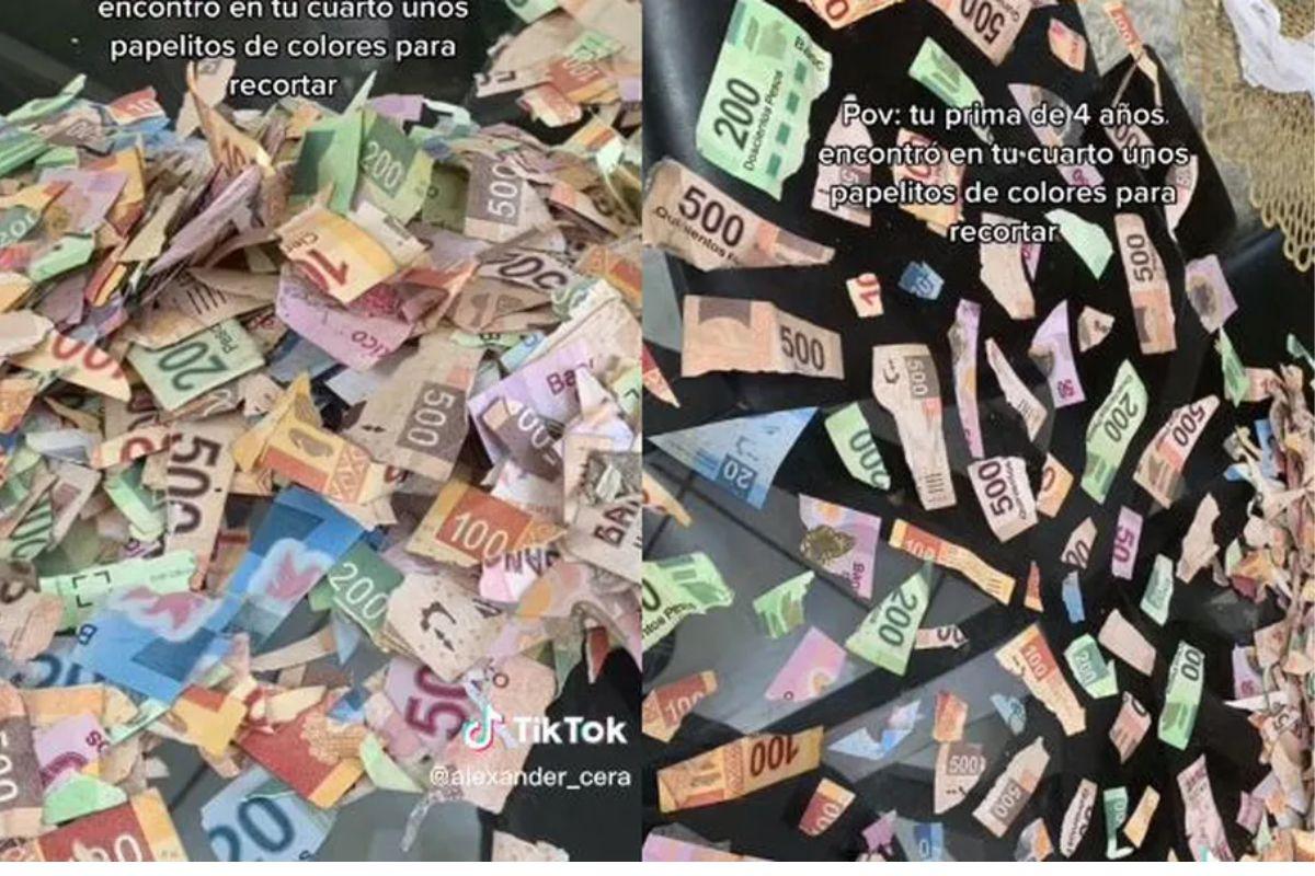 Uma menina, de 4 anos, confundiu dinheiro com papel colorido e recortou várias notas. Alexander Cera publicou um vídeo no Tik Tok mostrando “a arte’’ que a prima fez deu prejuízo muito grande para ele. Na rede social, o morador de Chihuahua, no México, contou que a criança pensou que as economias que estavam guardadas em seu quarto eram apenas papéis coloridos e que ela poderia brincar com eles.