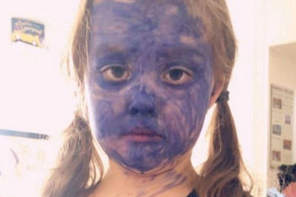 As crianças adoram imitar os personagens de desenhos animados e contos de fada e Skyla-Rae Muttram, de cinco anos, resolveu fazer o mesmo. Para fazer a “maquiagem” a menina usou uma caneta permanente roxa e arrancou gargalhadas da mãe, Jade Perry. A mulher revelou que “não sabia se ria ou chorava” da situação.