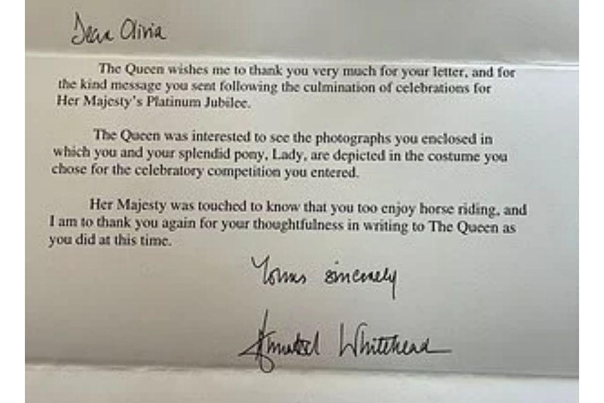 A carta, assinada pela dama de companhia Annabelle Whitehead, agradecia a Olivia por sua consideração ao escrever para Sua Majestade. “A rainha estava interessada em ver as fotografias que você incluiu nas quais você e seu esplêndido pônei, Lady, estão retratados no traje que você escolheu para a competição comemorativa em que participou”, dizia o bilhete.