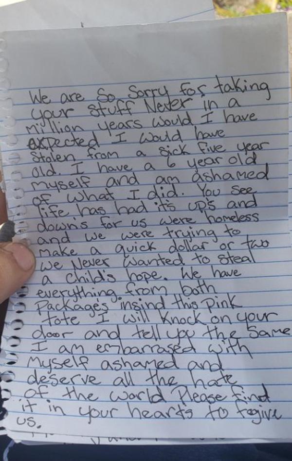 “Nós sentimos muito por roubar seu objeto. Nunca em um milhão de anos eu imaginaria que iria roubar algo de uma criança de cinco anos com uma doença grave. Eu tenho um filho de 6 anos de idade e estou com vergonha do que eu fiz. A vida tem seus altos e baixos para a gente, nós não temos onde morar e nós estávamos tentando fazer um dinheiro rápido. Nós nunca quisemos roubar a esperança de uma criança. Nós estamos desenvolvendo tudo o que levamos neste pacote rosa. Vamos bater na sua porta e dizer a mesma coisa. Eu estou sem jeito e envergonhada comigo mesma e mereço o ódio do mundo inteiro. Por favor, encontre um jeito de nos perdoar no seu coração”.