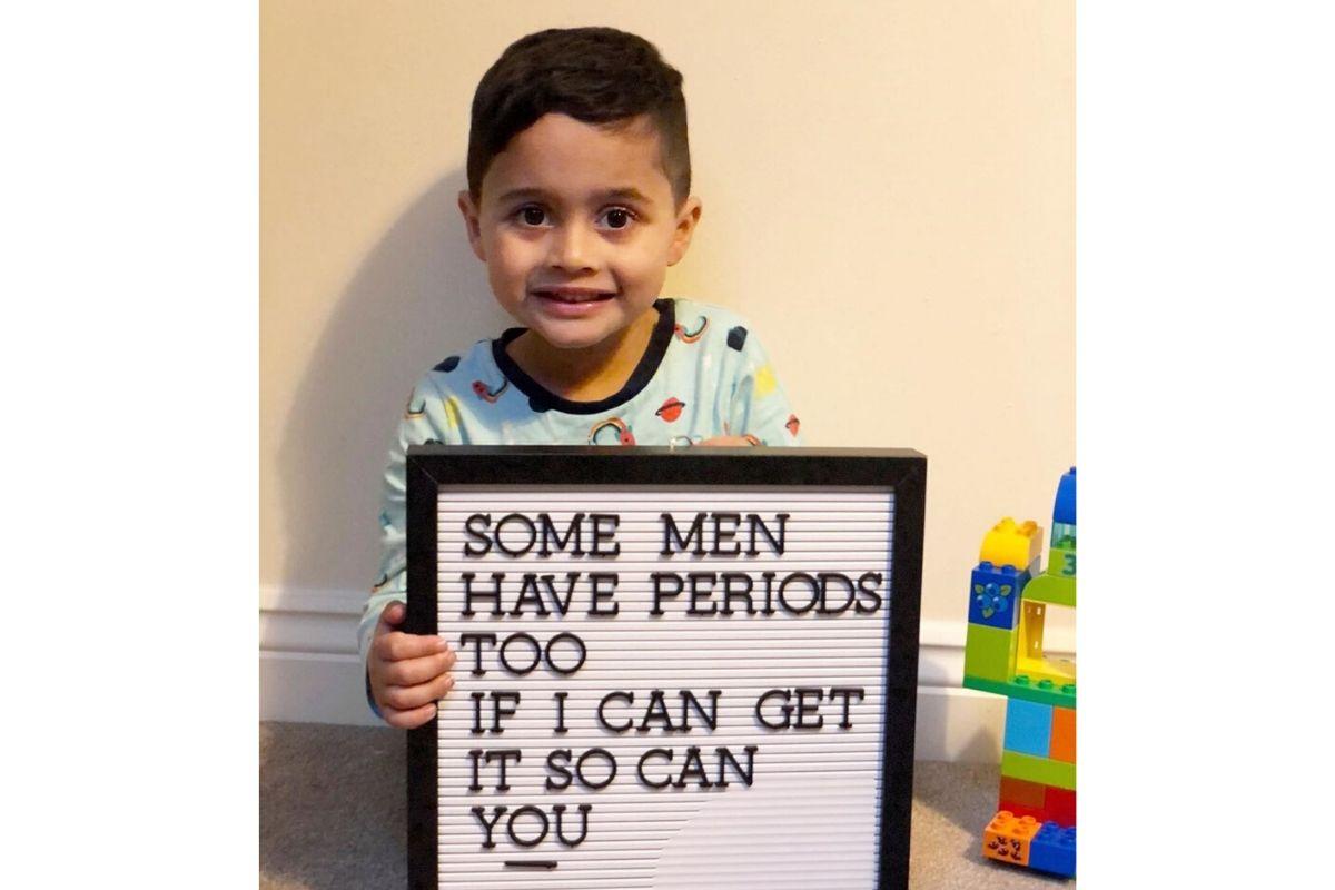 O menino está de pijamas, sorrindo e segurando a frase: “Alguns homens menstruam também. Se eu posso entender isso, você também pode”. Na legenda do post, Milly explicou que porque o filho estava “dizendo aquilo”.