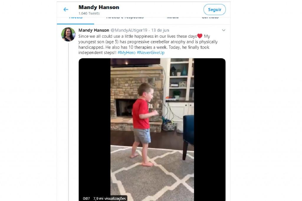 Com um olhar de determinação, o garoto Camden Hanson, que vive com uma condição cerebral que afeta a capacidade de se mover, finalmente deu os seus primeiros passos no último fim de semana, aos 5 anos de idade. Orgulhosa, a mãe do menino comemorou a conquista compartilhando nas redes sociais o vídeo emocionante que mostra Camden andando. “Como todos nós podemos ter um pouco de felicidade em nossas vidas nos dias de hoje: meu filho mais novo (5 anos) tem atrofia cerebelar progressiva e é deficiente físico. Ele também faz 10 terapias por semana. Hoje, ele finalmente andou sozinho! #MyHero #NeverGiveUp “, escreveu Mandy Hanson, no Twitter.