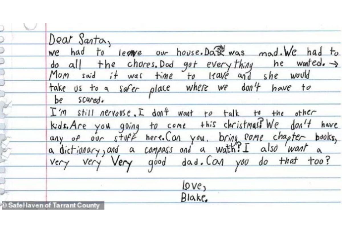 “Querido Papai Noel, tivemos que sair de casa. Papai estava bravo. Nós tivemos que fazer todas as tarefas. Papai conseguiu tudo o que queria. Mamãe disse que era hora de sair e ela nos levaria a um lugar mais seguro, onde não precisamos ter medo. Eu ainda estou nervoso. Não quero falar com as outras crianças. Você vai vir neste Natal? Não temos nenhuma das nossas coisas aqui. Você pode trazer alguns livros, um dicionário, uma bússola e um relógio? Eu também quero um pai muito, muito, muito bom. Você pode fazer isso também? Com amor, Blake.”