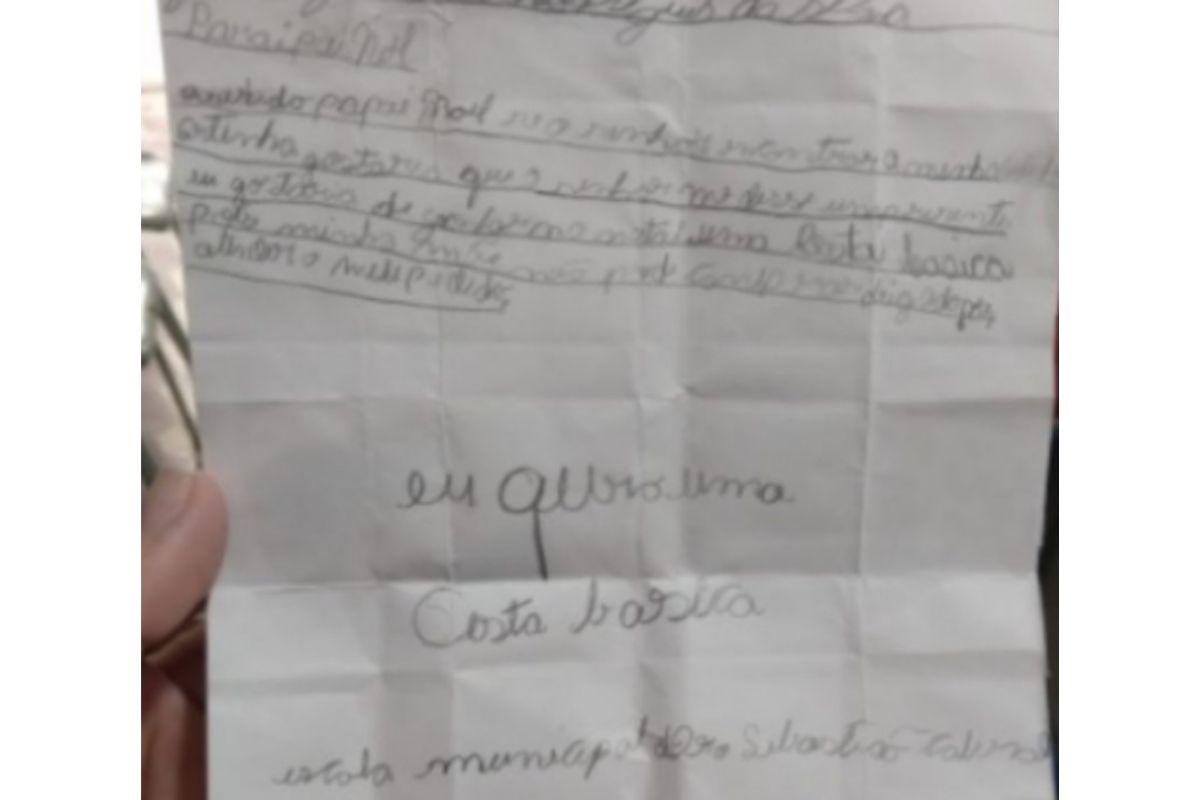 Na carta, ele escreveu: “Querido Papai Noel, se o senhor encontrar minha cartinha, gostaria que o senhor me desse um presente. Eu gostaria de ganhar no natal uma cesta básica, pois minha mãe não pode comprar. Obrigado por atender meu pedido”.