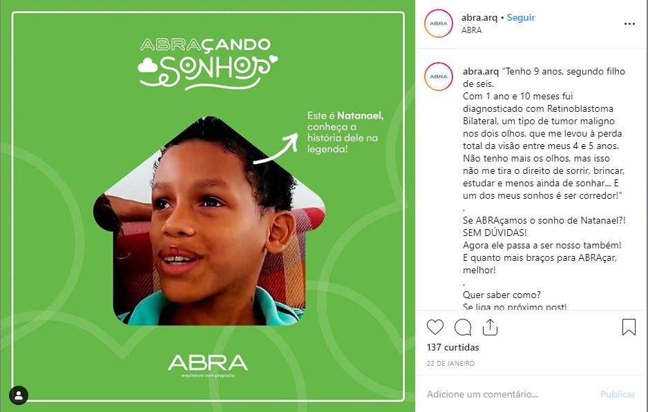 Natanael e os irmãos foram morar em um abrigo, onde recebiam visitas dos pais aos domingos. O ABRA, um projeto de arquitetura com propósito de ajudar as pessoas, criou a campanha “Abraçando Sonhos” e se voluntariou para arrecadar dinheiro e erguer uma nova casa para a família de Natanael.
