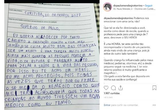 O médico postou a homenagem em sua rede social (Foto: reprodução/Instagram)Também à Gazeta do Povo, o dr. Paulo Mendes Junior falou sobre a surpresa e alegria com a carta, relembrando quando era criança e se inspirou em outros médicos. “Quem sabe o Augusto siga o mesmo caminho, não é mesmo? Tomara que seja uma inspiração para ele”, comentou.
