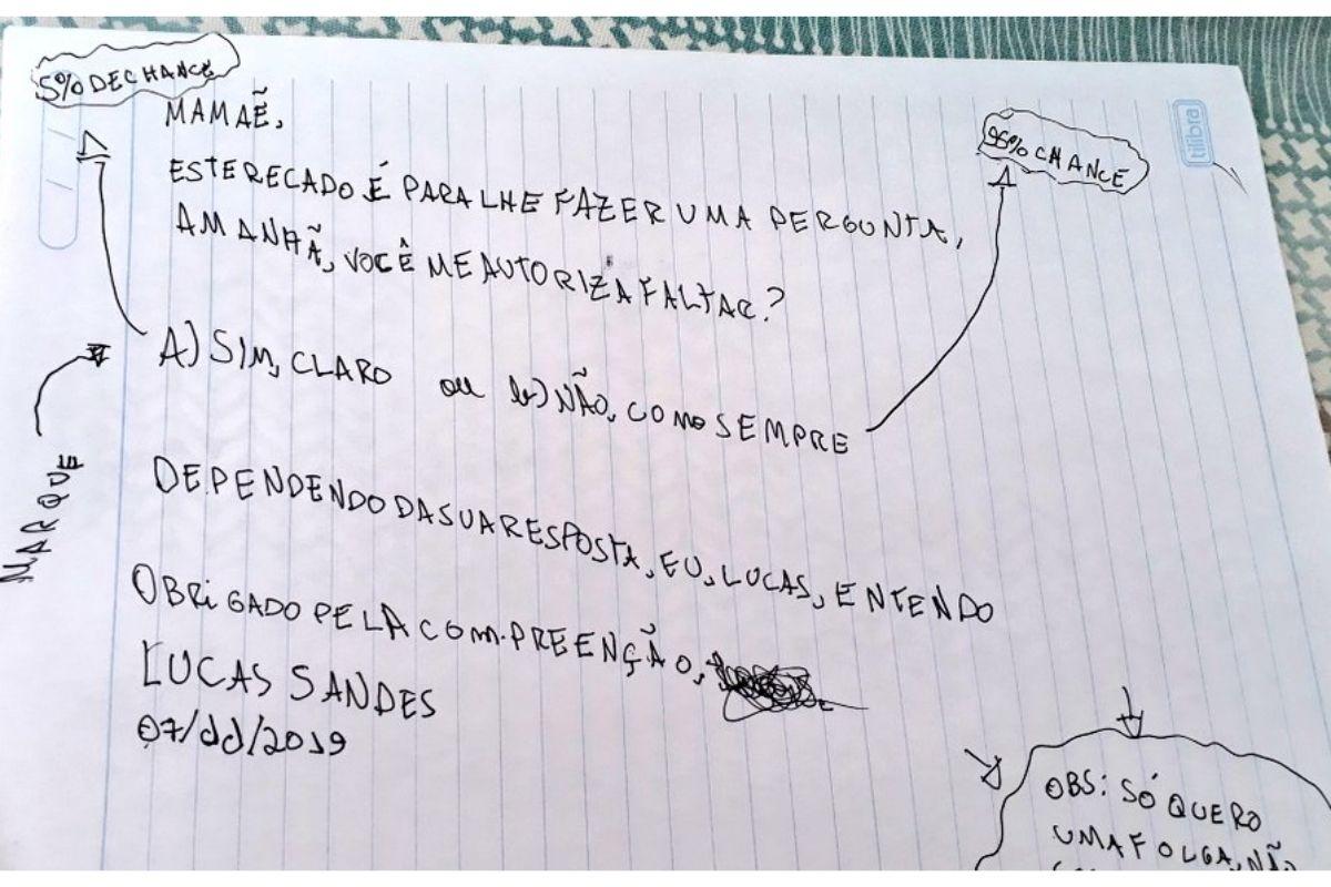 Na imagem compartilhada por Najara é possível ler que o menino além de escrever o pedido, já imaginava qual seria a reposta da mãe. Lucas fez setas indicado porcentagens de chance, recados e até rubricou o “documento“.