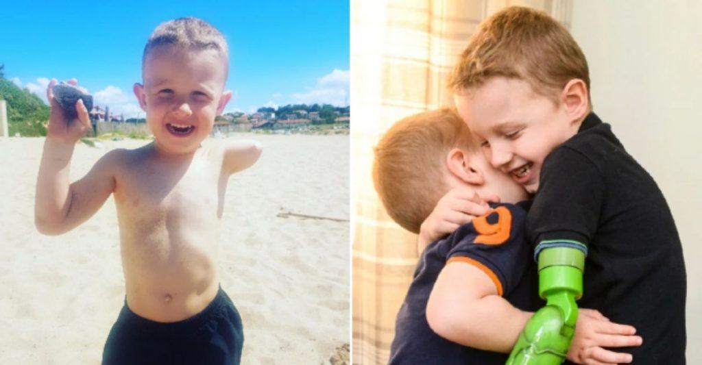 Jacob Scrimshaw, de cinco anos, nasceu sem uma parte do braço esquerdo e depois de muito esforço dos pais, Gemma Turner e Chris Scrimshaw, ele finalmente conquistou sua prótese e pôde abraçar o irmão, Sebastian, de três anos, pela primeira vez.