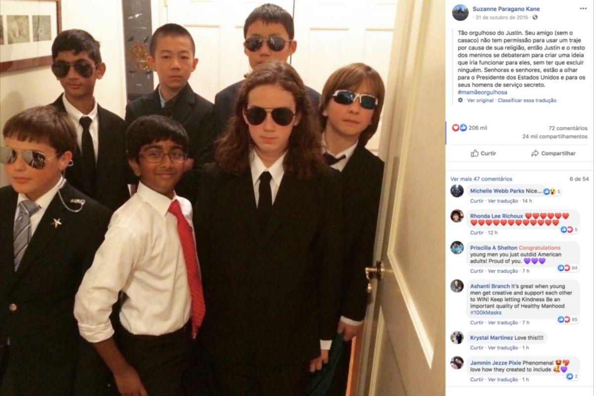 A mãe contou sobre a atitude de seu filho durante o Halloween de 2015, em que um dos seus amigos não podia se fantasiar por conta da religião. Eles não precisaram de muito para que pudessem incluir o colega na brincadeira, o grupo se inspirou no presidente dos Estados Unidos e sua equipe de segurança. Demais né!?
