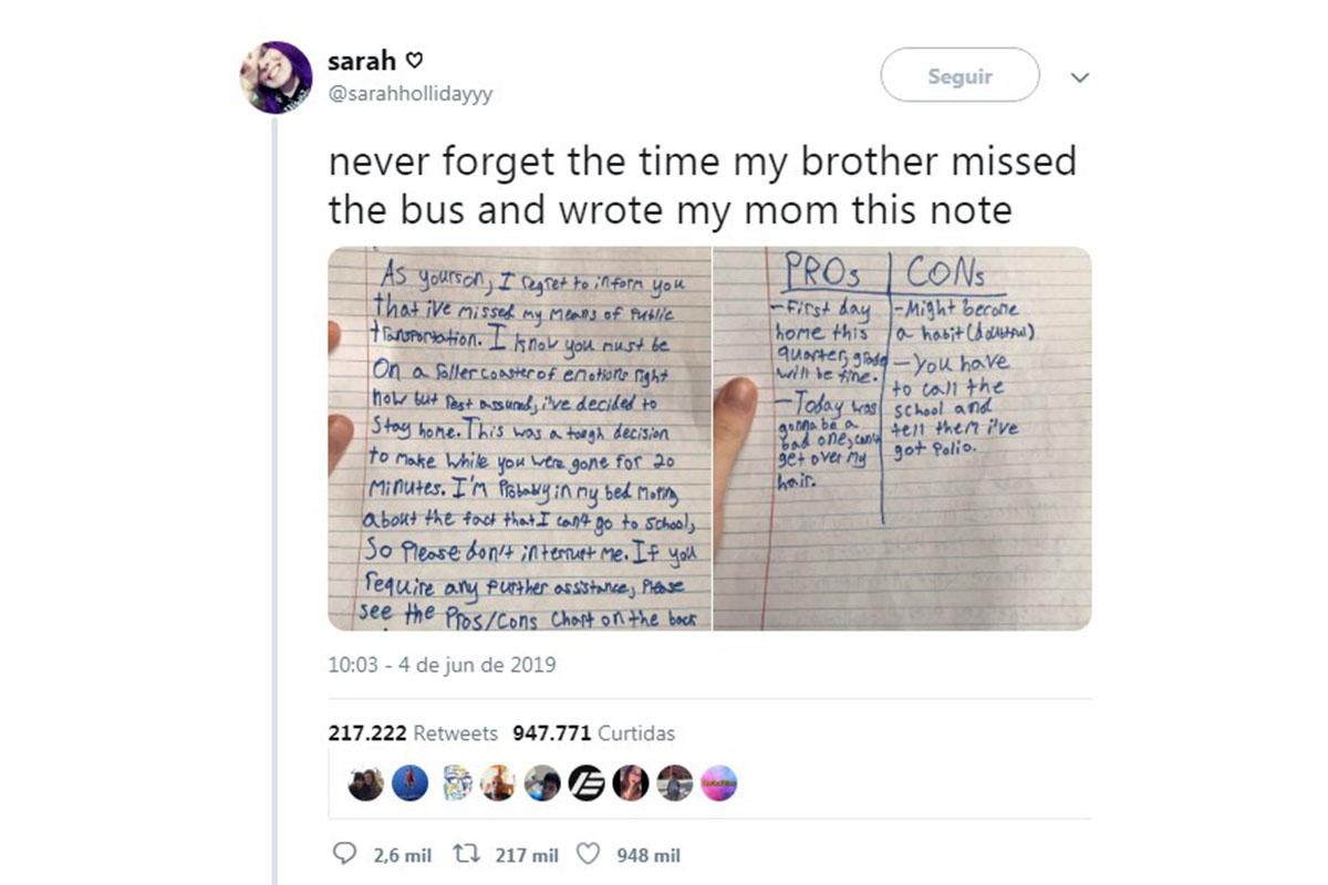 O que fazer depois de faltar à aula por perder o ônibus para a escola? O garoto dessa história que vamos contar escreveu uma carta hilária para a sua mãe, explicando toda a situação. A irmã dele, Sarah, compartilhou o bilhete no Twitter, dizendo: “Nunca se esqueça da vez em que o seu irmão perdeu o ônibus e escreveu uma carta para a sua mãe”.