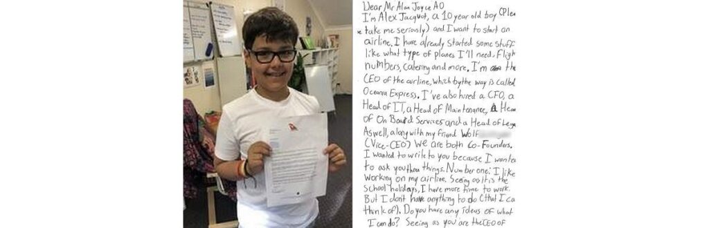 Alex Jacquot é um garoto australiano de 10 anos que sonha em abrir uma empresa de transporte aéreo. Pode parecer brincadeira de criança, mas o menino está muito sério, e ele deixou isso claro na carta que escreveu para Alan Joyce, o CEO da Qantas Airways, maior empresa aérea da Austrália.