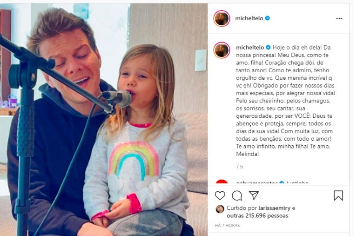 Michel abriu o coração e se declarou para a filha na legenda do post. “Hoje o dia é dela! Da nossa princesa! Meu Deus, como te amo, filha! Coração chega dói, de tanto amor! Como te admiro, tenho orgulho de vc. Que menina incrível que você é! Obrigado por fazer nossos dias mais especiais, por alegrar nossa vida! Pelo seu cheirinho, pelos chamegos, os sorrisos, seu cantar, sua generosidade, por ser você! Deus te abençoe e proteja, sempre, todos os dias da sua vida! Com muita luz, com todas as bênçãos, com todo o amor! Te amo infinito, minha filha! Te amo, Melinda!”, declarou o cantor.