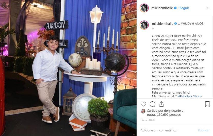 No Instagram, Mileide fez uma homenagem para Yhudy. “Obrigada por fazer minha vida ser cheia de sentido. Por fazer meu sorriso nunca sair do rosto depois que você chegou. Eu nasci junto com você há nove anos atrás e ter você foi a melhor decisão que eu já fiz na vida! Você é minha porção diária de força, alegria e resiliência! Que o Senhor continue refletindo muita luz em seu rosto e que você cresça com temor e amor à Deus! Pois eu sei que sua essência, alegria e caráter será influência e luz pra todos ao seu redor sempre! Feliz aniversário, meu filho! Mamãe te ama!”, declarou na legenda da publicação.
