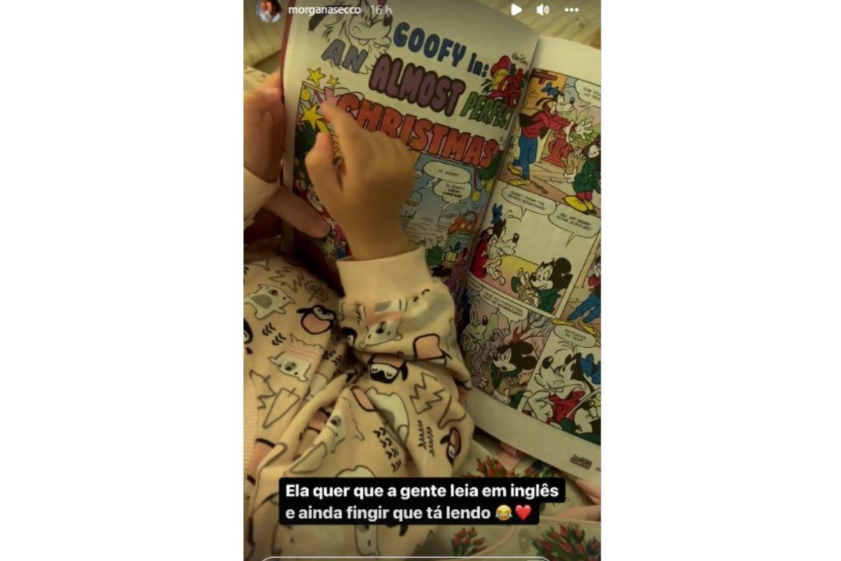 Nos stories, Alice aparece segurando uma história em quadrinhos enquanto está no colo de Morgana. A mãe, então, começa a ler a história em inglês, e a filha vai repetindo como se soubesse juntas as sílabas e entender as palavras. Muito fofa!