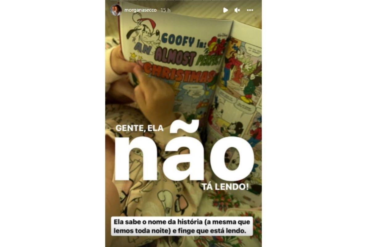 Na legenda do primeiro vídeo publicado, Morgana escreve: “Ela quer que a gente leia em inglês e ainda fingir que tá lendo kkkk”. Após isso, uma série de vídeos mostram o momento de mãe e filha na leitura.