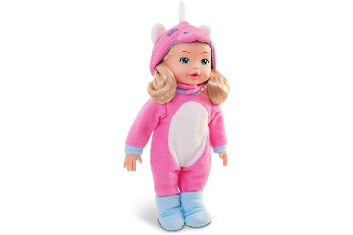 Uma linda boneca com uma roupa temática (um macacão) de unicórnio, uma das criaturas mágicas mais queridas das crianças.
