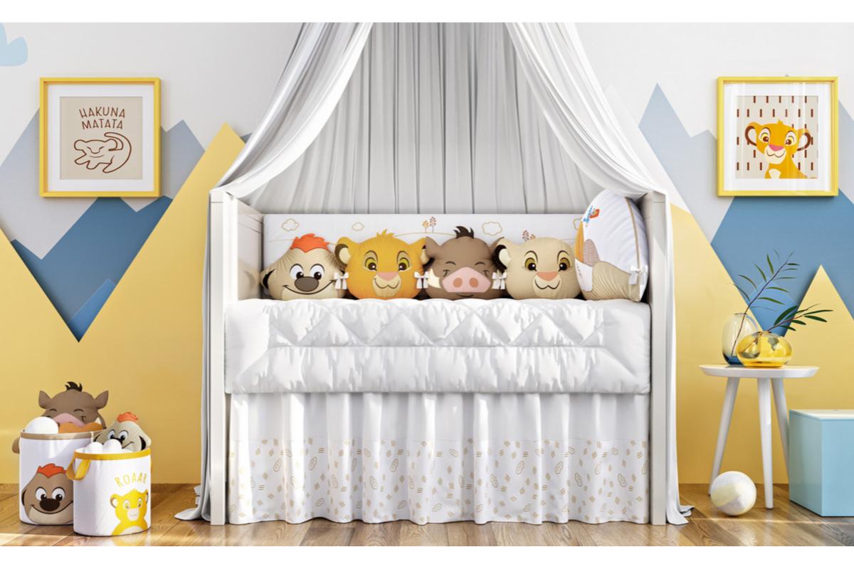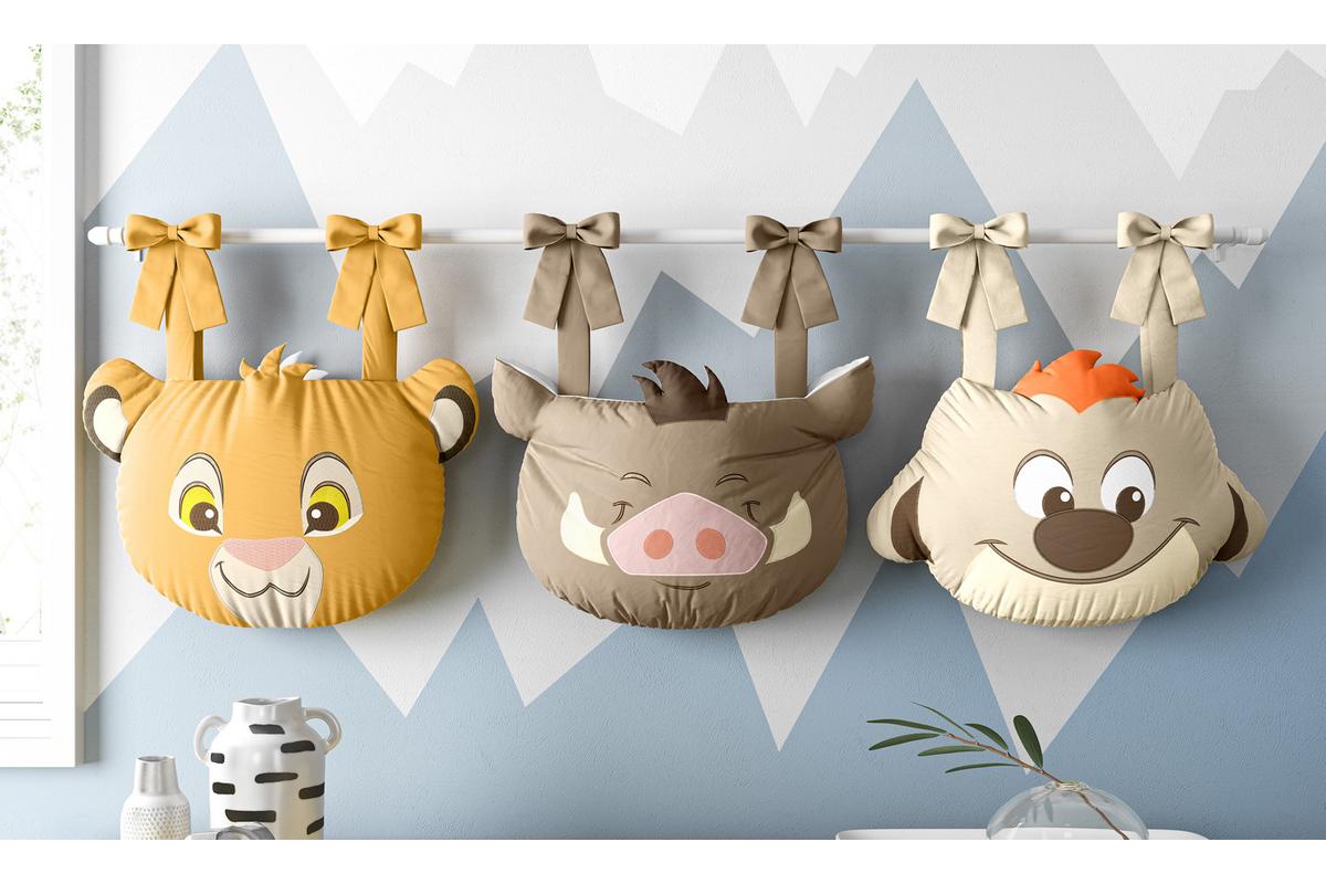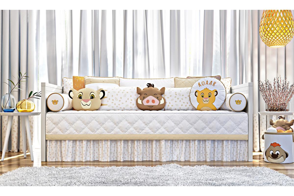 Amiguinhos O Rei Leão traz os personagens mais amados do clássico em peças apaixonantes, confeccionadas com tecido 100% algodão. Simba, Nala, Timão e Pumba estão representados com conceito original da marca, como almofadinhas protetoras inteiramente bordadas que aparecem no Kit Berço e Kit Montessoriano e podem ser usadas em camas infantis.