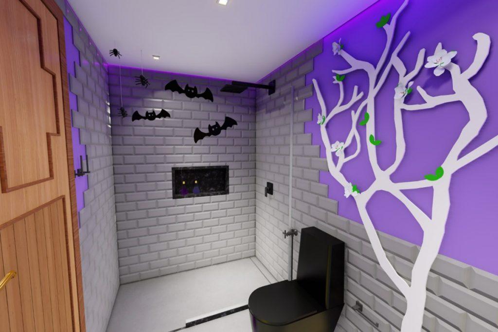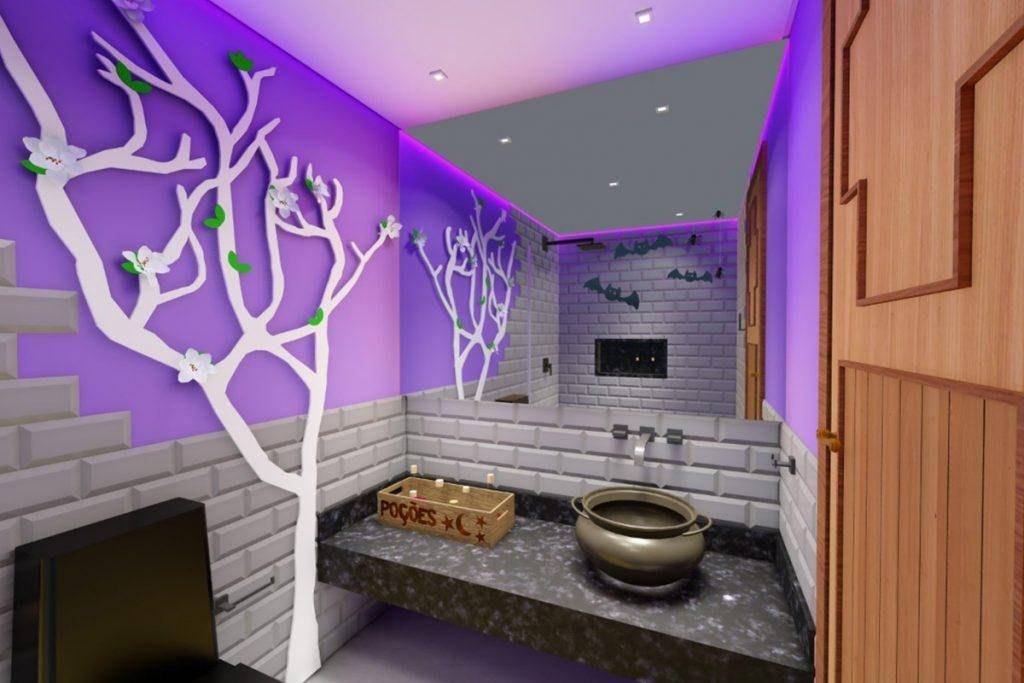 O banheiro foi inspirado na aprendiz de feiticeira, Berenice, com paredes roxas e morcegos espalhados. “O entretenimento está em nosso DNA em todas as vertentes e, por essa razão, nosso principal objetivo é trazer sempre novidades e experiências inéditas para o nosso destino”, comenta Flávia Possani, gerente de marketing da Aviva, detentora da Costa do Sauípe.