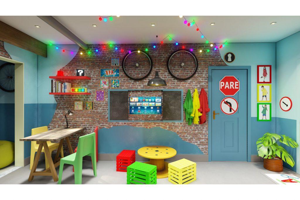 O quarto acomoda até quatro pessoas e não tem essa de só criança poder aproveitar, não! A suíte é para pessoas de todas as idades e oferece experiência totalmente interativa. De cara, já é possível reconhecer a referência da entrada do prédio da série, e no hall do pátio. Do lado de dentro, as peças remetem às capas amarela, verde e vermelha, de Bento, Pippo e Sol.